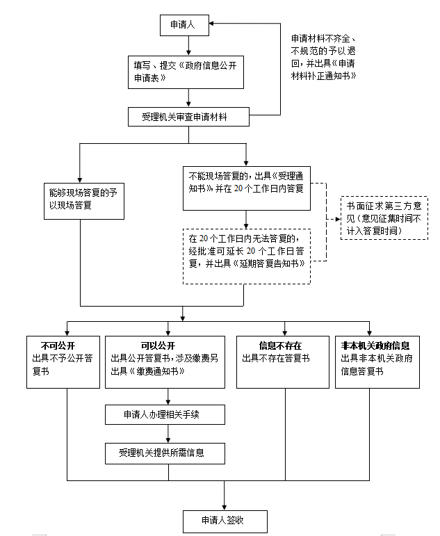 本機關收到政府信息公開申請后,予以登記,除可以當場答復的外,自收到申請之日起20個工作日內(nèi)予以答復;如需延長答復期限的,需經(jīng)本機關政府信息公開工作機構負責人同意,并告知申請人,延長答復的期限最長不超過20個工作日。(附件2:政府信息依申請公開辦理流程圖)